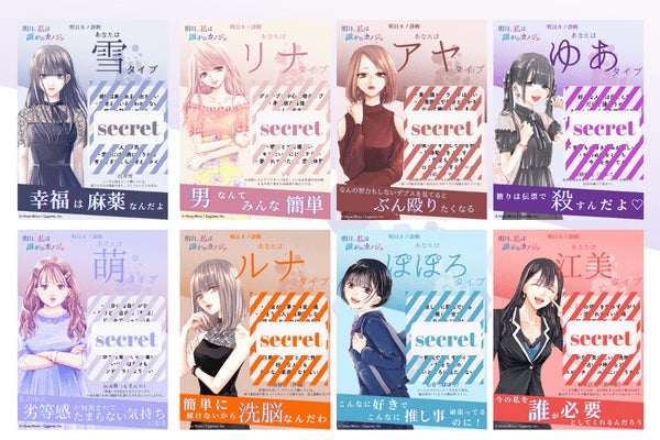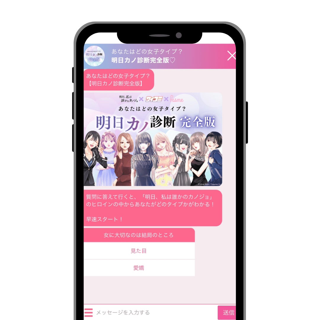 診断結果は『明日、私は誰かのカノジョ』に登場する雪、リナ、アヤ、ゆあ、萌、ルナ、ぽぽろ、江美の全8タイプ。チャット形式で質問に答えていくだけで、自身がどのキャラクターに当てはまるのかを診断できます。