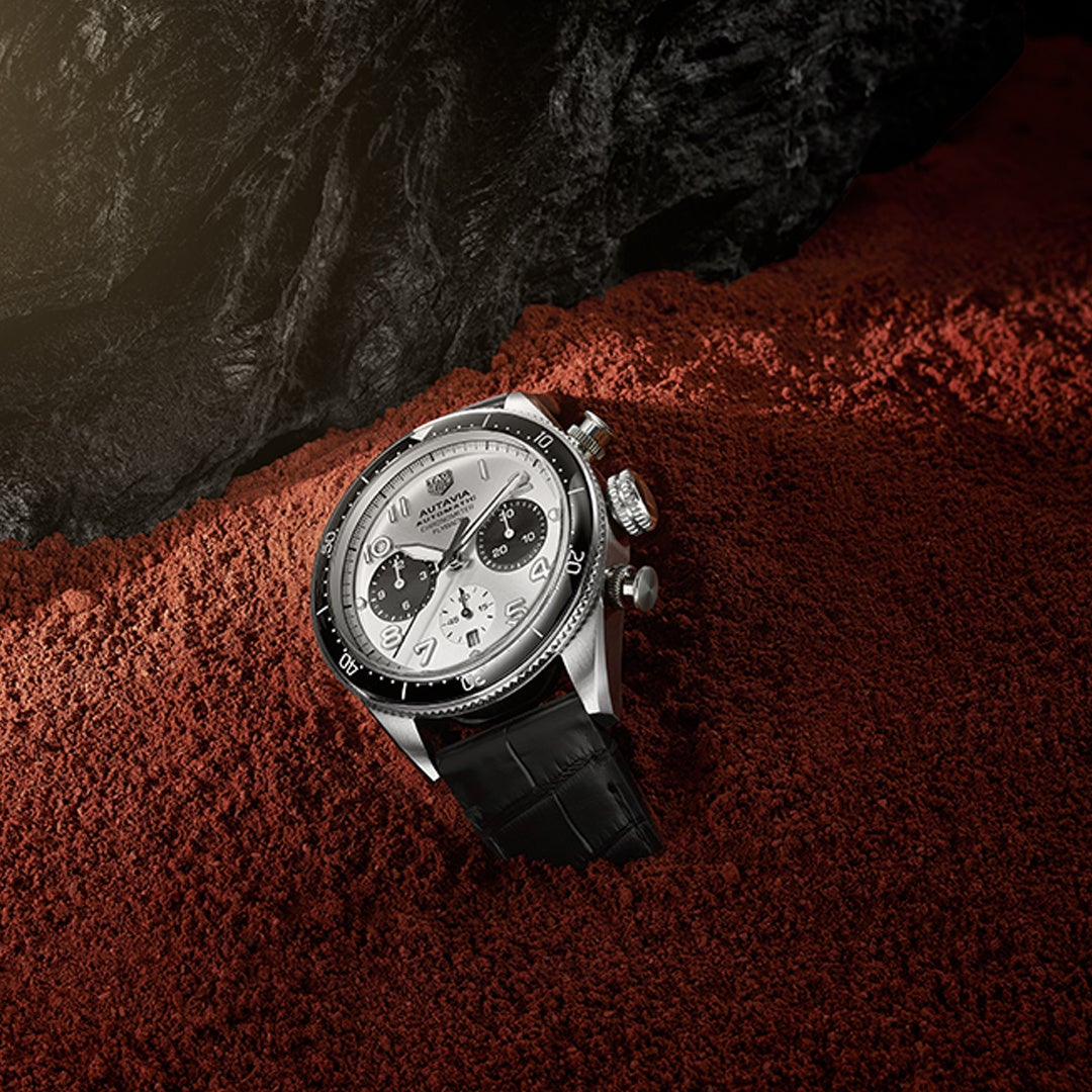 2つのクロノグラフモデルのうち、1つは1960年代に極めて限定的に生産された希少なパンダダイヤルへのオマージュで、シルバーダイヤルとポリッシュ仕上げのスティールケースを採用しています。もう1つのオータヴィア フライバック モデルは、ブラックダイヤルとDLCコーティングされたケースを採用し、過去のミリタリーモデルとの直接的なつながりを打ち出しています。