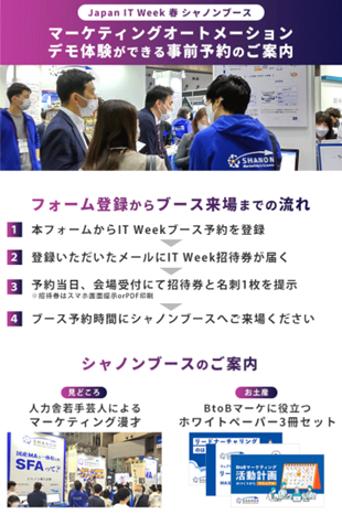 シャノンブース内で、デモ機を用いたマーケティングオートメーションの活用体験を提供する予定であり、事前予約が可能です。