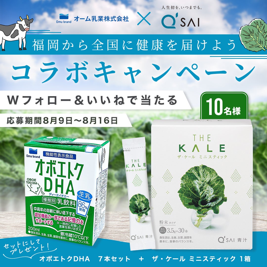福岡県大牟田市に本社を構えるオーム乳業は1934年に創業し、「乳を通して、おいしさと健康に貢献する」という企業ミッションを掲げ、質と鮮度を大切にした乳製品にこだわり、おいしさに機能性を加えた新しい価値を追求しています。また、福岡県福岡市に本社を構えるキューサイは1965年に創業し、カラダもココロも健康で前向きに歳を重ねる「ウェルエイジング」な社会の実現を企業ミッションとして掲げ、ケール青汁をはじめとしたヘルスケア商品、スキンケア商品、サービスを展開しています。50年以上福岡で歴史を刻む老舗企業である両社の「人々の健康をサポートしたい」という想い、そして今年の猛暑を乗り切る一助となればという願いが合致し、コラボレーションをする運びとなりました。
