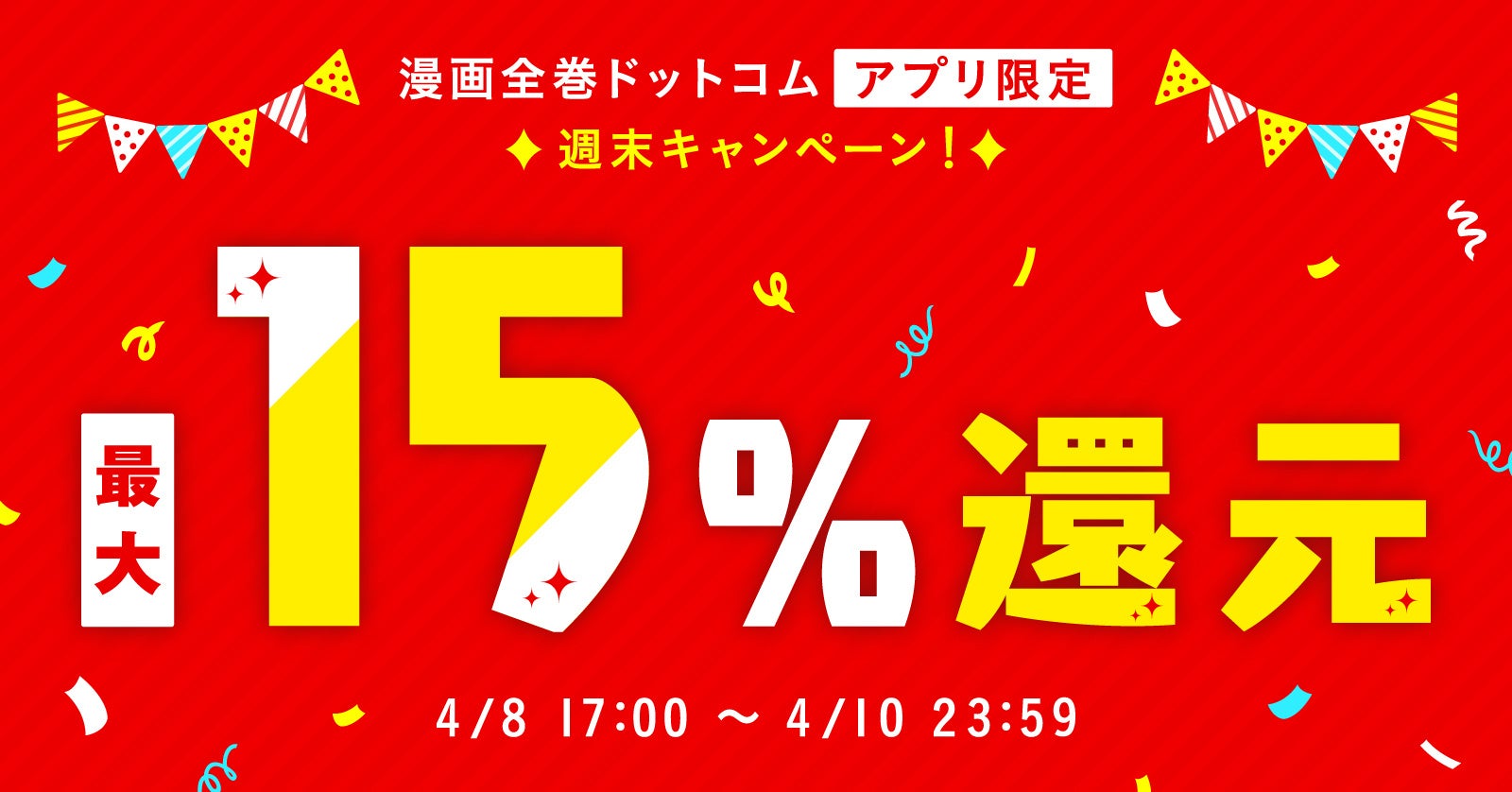 【漫画全巻ドットコムアプリ】週末限定!最大15%ポイント還元キャンペーン開催中!