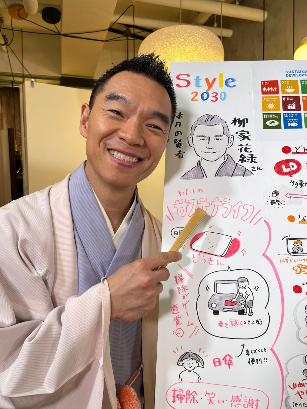 「Style2030」の“名物”が「グラレコ(グラフィックレコーディング)」。「グラレコ」は、情報共有に優れたビジネススキルとしてNASAやGoogleが活用、日本でも注目されている。イラストや図を入れた板書で、柳家花緑さんとの対談がリアルタイムで“見える化”されていく様子にも注目。