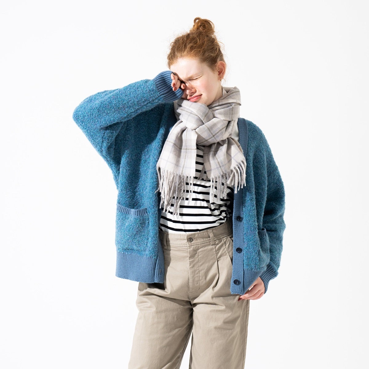 ブークレVネックカーディガン ¥7,480、ストール ¥4,400、ボーダーボートネックプルオーバー ¥6,490、ストレッチチノタックパンツ ¥7,480