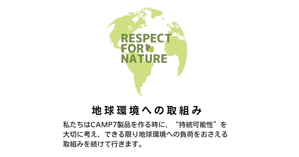 社会環境や自然環境の大きな変化を感じる日々の生活の中で、自然の大切さを感じて楽しんでほしい、環境に配慮した衣類を身に着けてほしい、より良い未来をつくりたい、という思いから、“CAMP7” では “持続可能な地球環境” を第一に考え、環境負荷低減に向けた取組みを積極的に行っています。