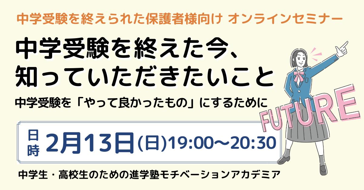 株式会社リンクアンドモチベーション(本社:東京都中央区、代表:小笹芳央、証券コード:2170)のグループ会社で、学習塾「中学受験専門個別指導教室 SS-1」(https://www.ss-1.net/)を運営する株式会社モチベーションアカデミア(本社:東京都中央区、代表:柿木秀雄、以下当社)は、2022年2月13日(日)にオンラインセミナー『中学受験を終えた今、知っていただきたいこと ー中学受験を「やって良かったもの」にするために』を開催いたします。