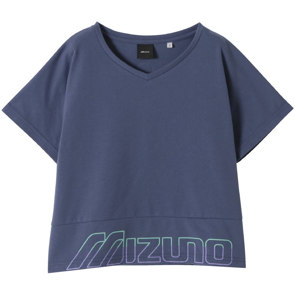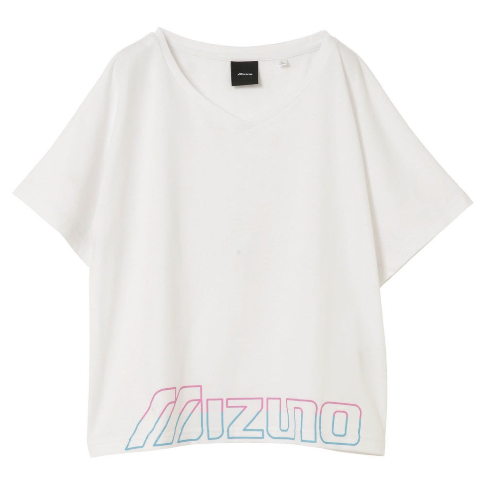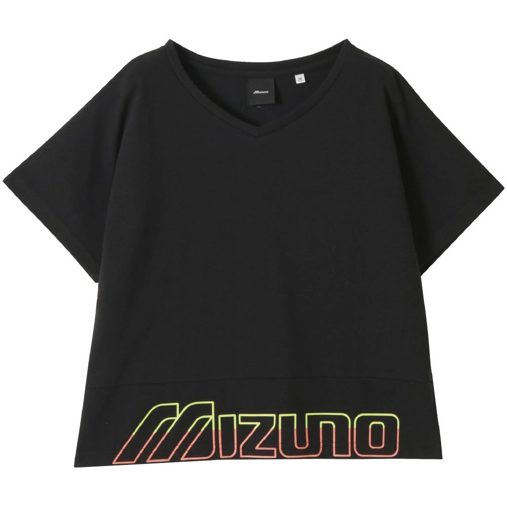 短めの丈で他のアイテムとのコーディネートが楽しめます。V首で首元がすっきり見えるデザインです。裾にあるMizunoロゴのグラデ―ションがポイントです。
