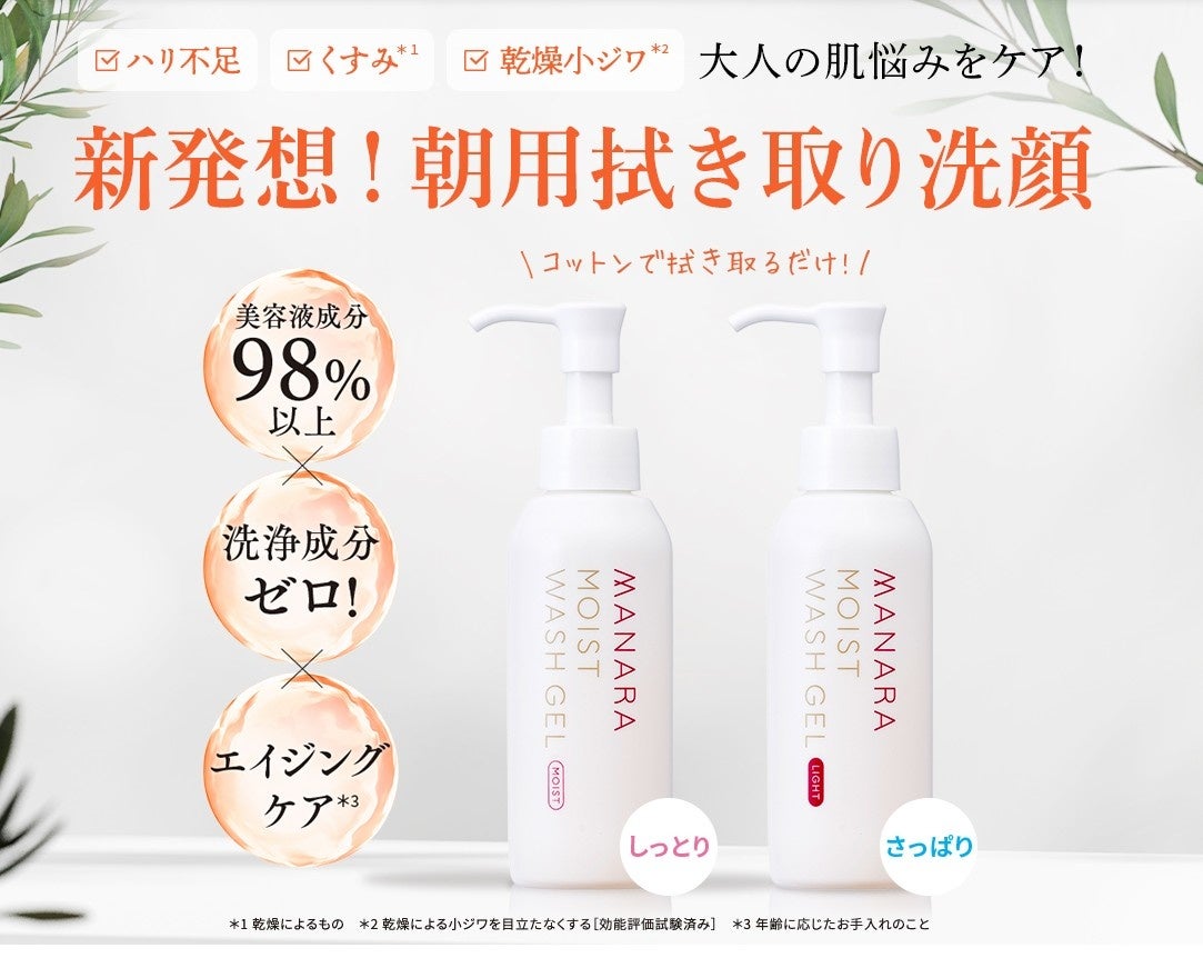 今回寄付した「マナラ モイストウォッシュゲル」は、98%以上が美容成分で作られた朝用洗顔料です。水洗い不要で、コットンでサッと拭き取るだけで洗顔と保湿が同時に完了するため、洗面所に行く時間がない場面でも、お子さまのそばから離れることなくスキンケアができます。