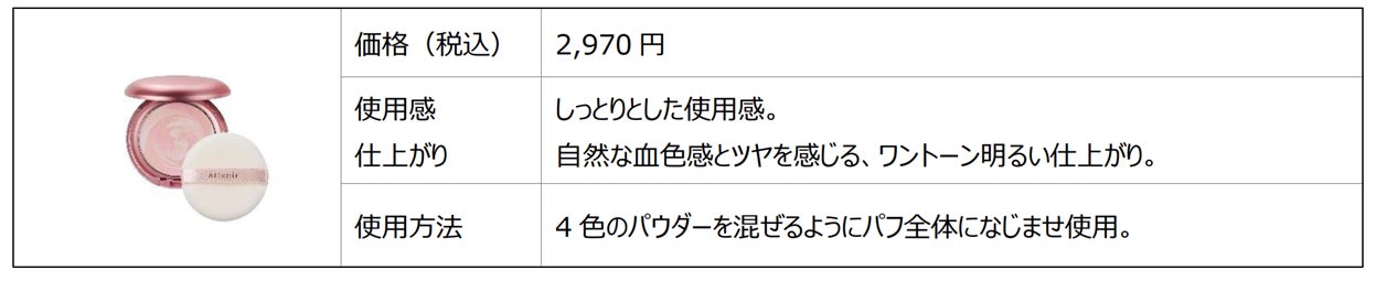光を操る4色のパウダーで自然な血色感・ツヤを与え、美しい肌を演出。肌の色と調和するベージュ、ツヤ・透明感をアップするオフホワイトベージュ、血色感をアップする濃淡ピンクでのシナジー効果で、くすみや凹凸をカバーしながら透明感と立体感をアップするマルチタスクパウダー。