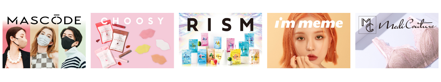ファッションと機能性を兼ね備えたマスクブランド「MASCODE(マスコード)」、“くちびる専用パック”をはじめとするアイテムを展開する『CHOOSY(チューシー)』、現代人の不規則な生活や外部刺激の影響を受けやすい肌環境に着目したスキンケアシリーズ『RISM(リズム)』など、ボディケア、ヘアケアを中心に化粧品や美容雑貨、栄養補助食品等、幅広い商品を独自に企画・開発しています。また、話題の韓国コスメ「I’m meme」(アイムミミ)をはじめ海外ブランドの輸入代理、自社ECショップ限定のラグジュアリーインナーブランド「MediCouture(メディクチュール)」の取り扱いもございます。