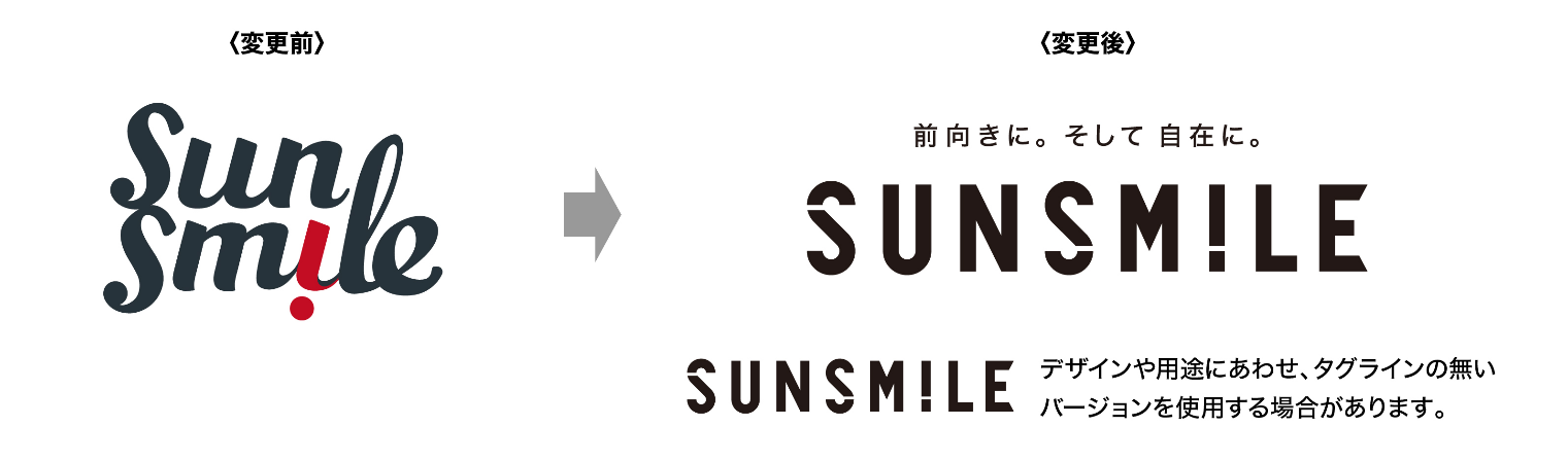 「社員ひとりひとりが 笑顔のクリエーター。」というビジョンのもと、世界中のお客様がサン・スマイルの商品やサービスを手に取ったときに笑顔とワクワク感に包まれる光景をたくさん作り出すことを目指しています。旧ロゴデザインで使用していた「常にニッチで面白く、個性的であれ」という精神を表す「!」を残しつつ、時代への変化対応を加速させる想いを込めて、一体感、スピード感、どんなトーン&マナーにもフィットする自在感を表現したデザインに変更いたします。また、行動指針としても掲げている「前向きに。そして 自在に。」というコーポレート・フィロソフィーをタグラインに加えました。これを機にコーポレートサイトもリニューアルいたします。「サン・スマイル」ブランドのさらなる認知拡大を目指し、顧客価値向上に努めて参ります。