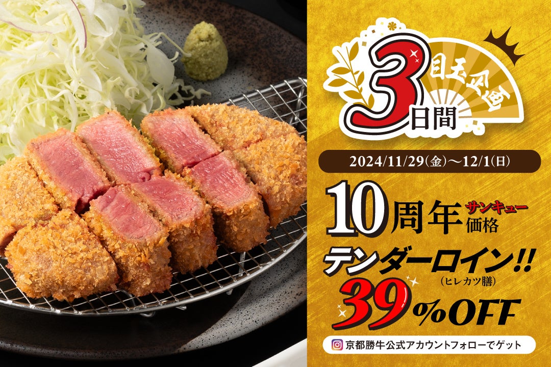 牛カツ京都勝牛からお客様へ10年分の感謝の気持ちを込めて、2024年11月26日(火)~12月8日(日)までの期間限定で、縁起担ぎの「三三七拍子(さんさんななびょうし)」をテーマに13日間に渡って3つの特別企画を開催!