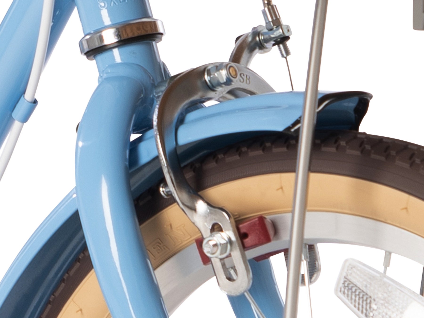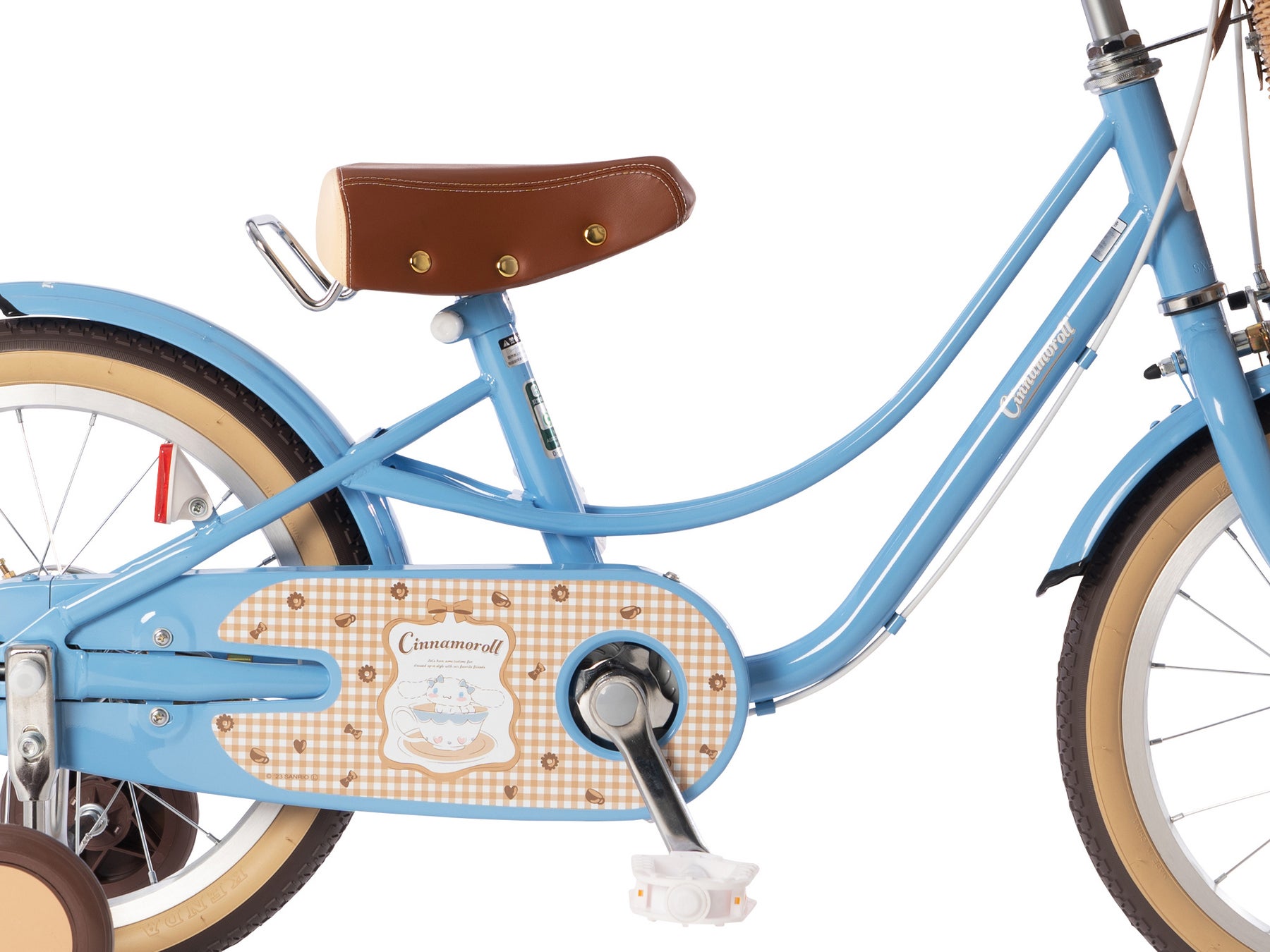 車体のカラーはシナモロールをイメージした淡いブルーを採用。フレーム、サドル、補助輪にはシナモロールのロゴを、チェーンケースにはカフェをイメージしたシナモロールをデザイン。サドル後部には自転車を支える際に便利な持ち手を付け、お子様だけでなく親御様にも気に入っていただけるような機能性も備えています。製造においては当社が定める厳しいテストをクリアし、また国も認めた安全・安心で環境に優しい自転車の目印であるBAAマークを取得するなど、安心してお乗りいただける自転車となっています。