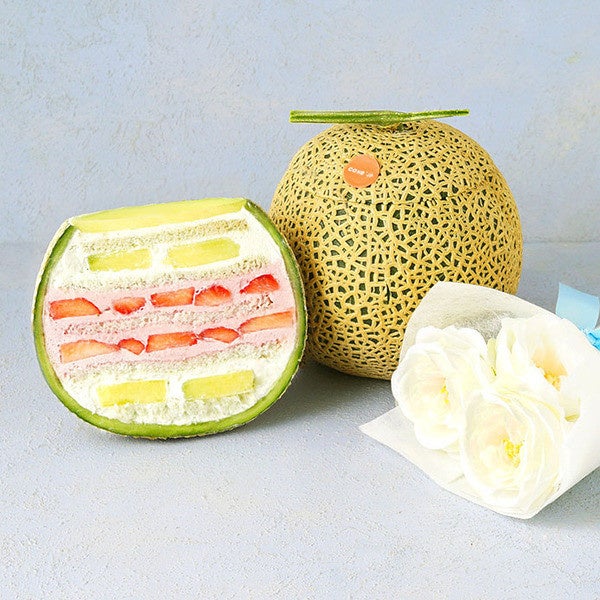 Cake.jpオリジナル商品のまるごとメロンケーキがホワイトデーバージョンで登場!中身をくり抜いたメロンの中に自家製のふわふわスポンジケーキ、メロン風味の生クリーム、マスクメロンの果肉、イチゴがミルフィーユ状に丁寧に重なり合って詰め込まれています。見て楽しみ、切って驚き、食べて美味しい大満足のスペシャルケーキです。