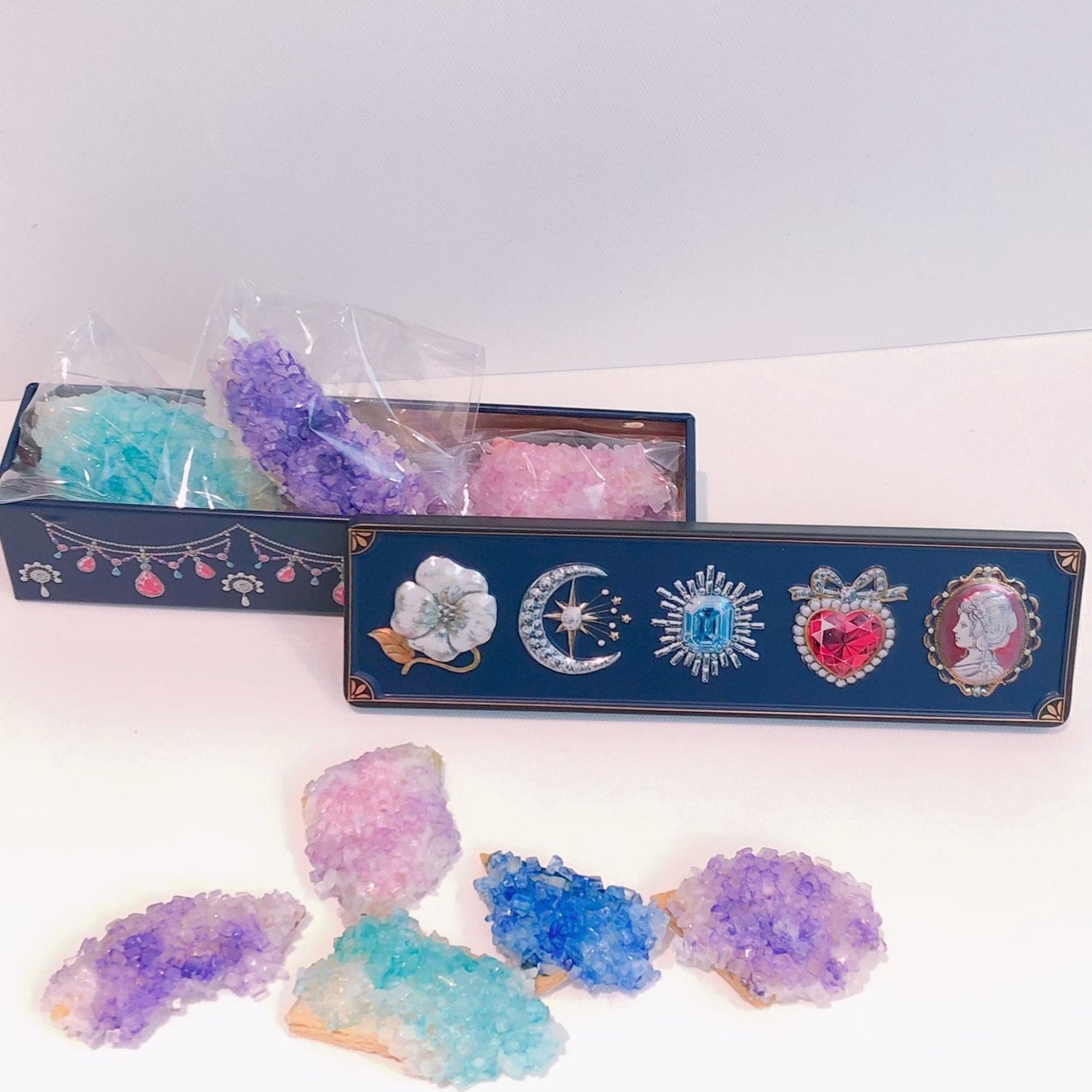 まるで本物の宝石のようにキラキラと輝くアイシングクッキー。鉱石、アメジスト、エメラルドなどをイメージしています。見た目も可愛い「ビジュー缶」はSNSでも女性に大人気です。