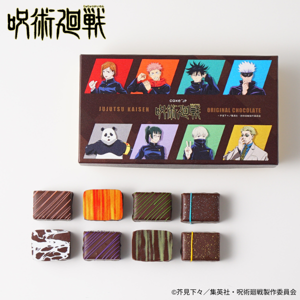 大人気TVアニメ『呪術廻戦』とCake.jpのコラボ商品第4弾。 人気主要キャラクター8名をイメージしたデザインのお洒落なチョコレートです。高品質なチョコレートは香り高く、なめらかな口当たりも魅力の一つ。見た目にも味にもこだわったひと品です。