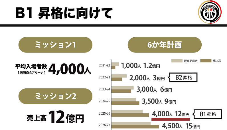 鹿児島を動かす新たな『チカラ』となることを目指す鹿児島レブナイズは、クラブを愛してくださるブースターやスポンサーの皆さまと共にB1優勝を目指します。B1昇格するためには、平均入場者数4,000人、年間売上12億円が必要となります。今回の資金調達は、これらを実現させる上での第一歩となります。