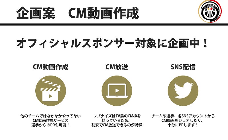 年間120万円以上のオフィシャルスポンサーを32社集めることを目指します。オフィシャルスポンサーには、今までのPR活動にプラスして、15秒の動画作成をスポンサー費用の内にて行います。希望があった場合は、鹿児島のTV局と連携をしてこの動画をTVCMに出していけるようにします。(別費用)また、あわせて、希望のあったスポンサー企業のWEBサイトにレブナイズキャラクターがチャットbotにて応対するシステムを7 月より順次無料搭載していく予定です。オンライン秘書neneと連携をした、有人チャット代行も行います。(別費用)