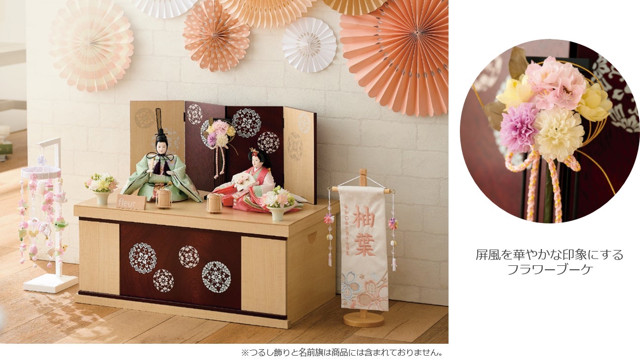 木目調に浮線綾模様を屏風と収納箱に施し、華やかな造花のブーケを配しました。