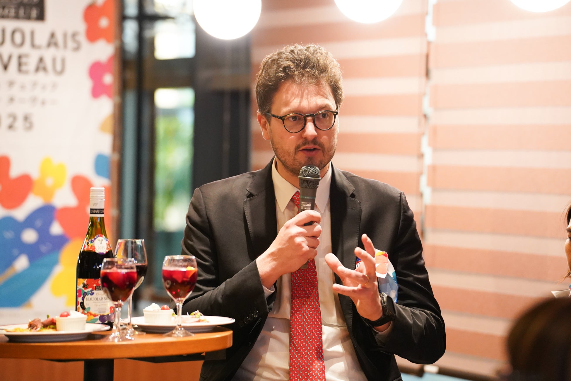 「このボジョグリア は、フレッシュなボジョレー・ヌーヴォーの味わいを活かした、果実味たっぷりのフルーツサングリアです。もっとカジュアルに、もっと楽しく味わってほしいという想いから生まれました」と語り、会場を盛り上げました。