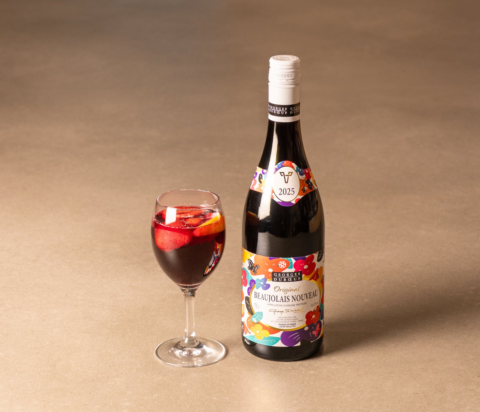 フレッシュな「ボジョレー・ヌーヴォー」の味わいを活かした、果実味たっぷりのフルーツサングリアです。 ワインをもっと気軽に楽しんでいただきたいという想いを込め、アルコール度数はワインとしては低めの6%程度に抑えました。年に一度の「ボジョレー・ヌーヴォー」解禁をきっかけに、「ワインを飲んでみようかな」と思っていただけるような、親しみやすくフレッシュで華やかな味わいに仕上げています。ワインを日ごろ飲まない方にもお楽しみいただけます。