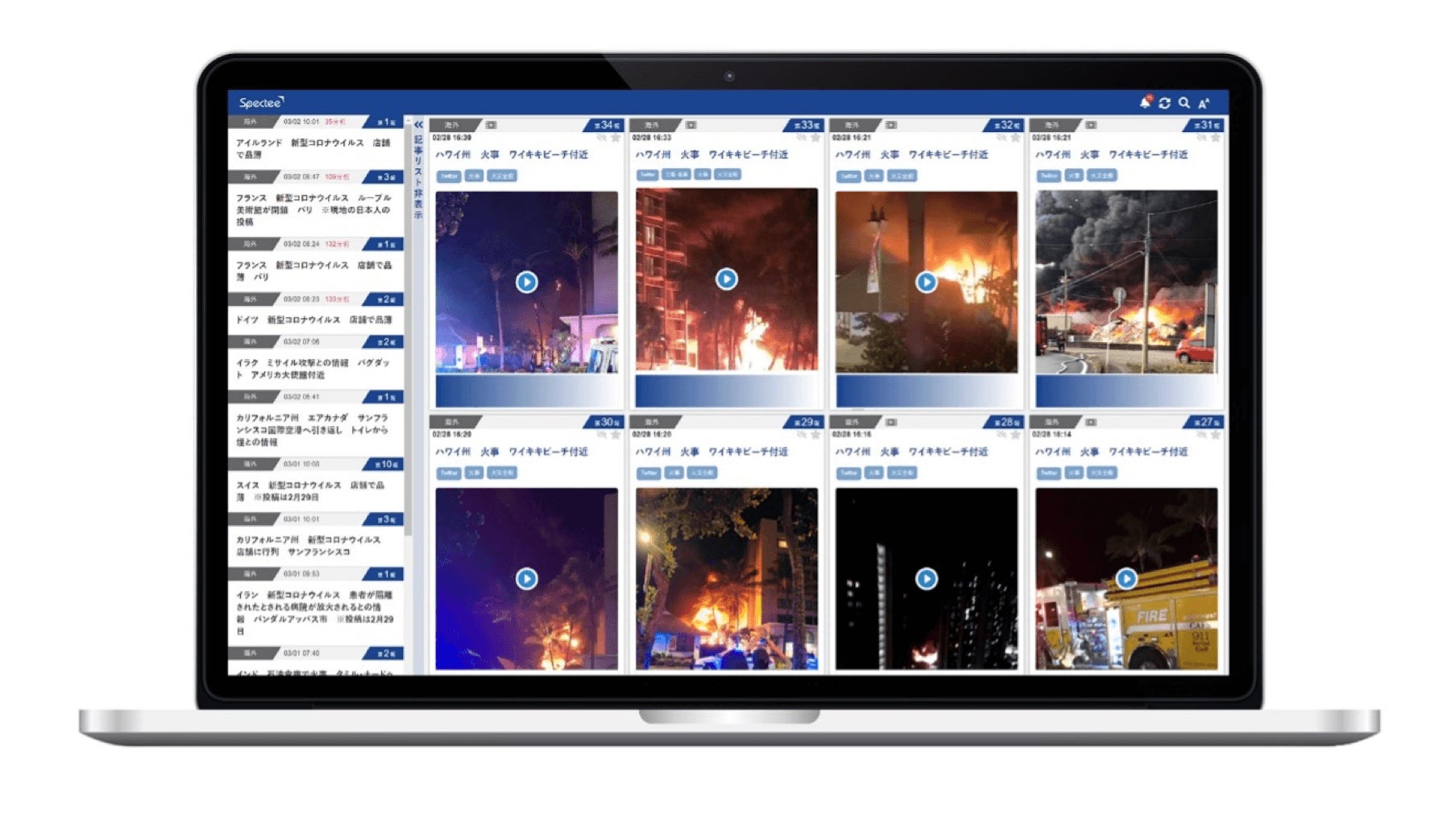 「Spectee Pro」はさまざまな「危機」情報を AI でリアルタイムに解析してリスク対応に必要な情報を現地の画像・動画と共に配信することで被害状況を可視化するサービスです。災害時の初動対応の意思決定、防災・リスクマネジメントに役立ちます。