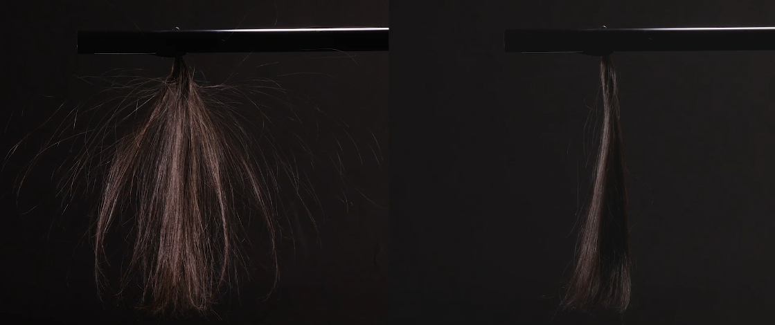 イオンを同時発生させる独自のWイオナイザーを搭載。プラスに偏りやすい髪のイオンバランスを瞬時に整え、約5秒間で約98%*4 の静電気を除去。ヘアドライ後のパサつきを抑えてまとまりのある髪に整えます。