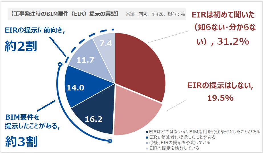 「建設プロジェクトの品質と計画通りの実行に必要なこと」の1位に「BIMの活用による設計・施工プロセスの生産性向上(33.6%)」が上がっていたことから、「工事発注者として工事受注者に求める詳細なBIM要件をまとめた発注者情報要件(EIR:Employer Information Requirementsの略)の提示実態」について質問したところ、最多が「EIRを初めて聞いた(31.2%)」、次いで「EIRの提示はしない(19.5%)」との結果になりました。