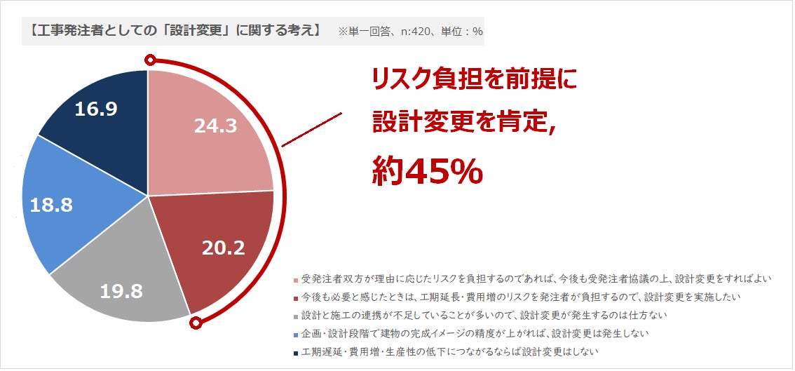 設計変更は、工期遅延・建設費用の追加発生の原因になり、建設プロジェクトの生産性を引き下げると言われていますが、 発注者の設計変更に対する考えの最多は「受発注者双方が設計変更の理由に応じたリスクを負担するのであれば、今後も受発注者協議の上、設計変更をすればよい(24.3%)」でした。