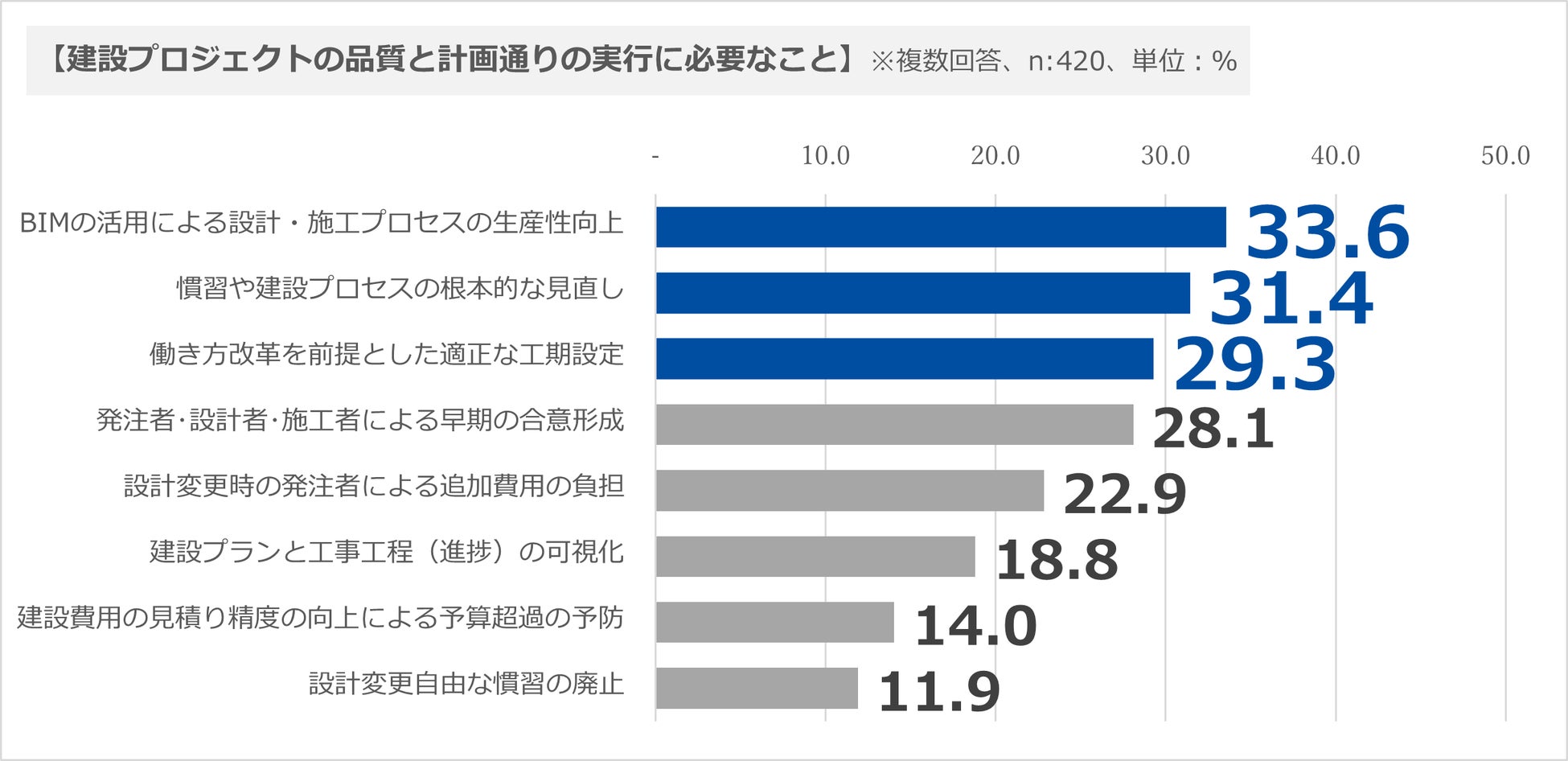 「今後、建設プロジェクトの品質を落とさず、計画通りに実行(設計・着工・竣工引渡し)するために必要だと思うことを教えてください(複数回答可)」と質問したところ、1位「BIMの活用による設計・施工プロセスの生産性向上(33.6%)」、2位「発注者・設計者・施工者を交えた、慣習や建設プロセスの根本的な見直し(31.4%)」、3位「働き方改革を前提とした適正な工期設定(29.3%)」でした。