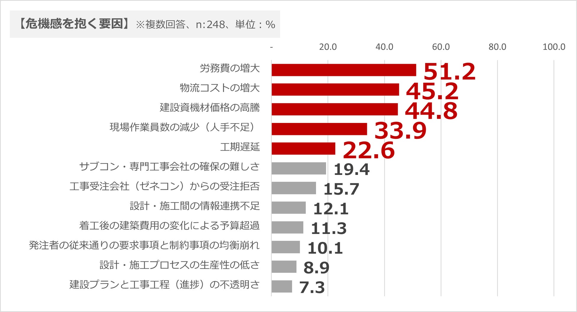 危機感を抱く要因のトップ3は、1位「労務費の増大(51.2%)、2位「物流コストの増大(45.2%)」、3位「建設資機材価格の高騰(44.8%)」で建設費用の高騰が背景にあると推測できます。 -