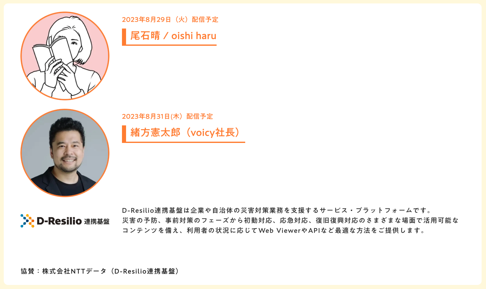 「今年の防災の日には、2023年を生きる私たちがいつ来るか分からない災害に対して備えること・できることは何か、個人の視点と企業の視点で、一緒に考える放送がしたい!とVoicyさんに相談しました。 二人の素敵なパーソナリティさんのチャンネルにお邪魔し、尾石晴さんとの対談では自分の軸を持ちながら、突然訪れる脅威にもしなやかに対応する力「レジリエンス」を高めるヒントを伺いました。またVoicy緒方社長との対談では、組織の垣根を越えたつながりや、災害時に「声」が果たす重要な役割について熱く語り合いました。今回の対談をきっかけに、NTTデータの防災・レジリエンスの取り組み「D-Resilio®」を皆さんに知っていただくとともに、私たちの目指す社会や想いに、共感してくださる人を少しずつでも広げていけたらと思います。」