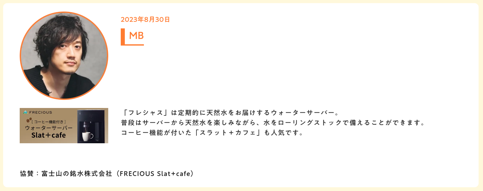 「なかなか自分ごとにしにくい災害対策ですが、何かがあってから慌てて準備するのではなく、日常生活から水を備蓄出来るのがウォーターサーバーのメリットの一つ。「フレシャス」のウォーターサーバーは定期的に天然水をお届けするため、普段はサーバーから天然水を楽しみながら、常に水をローリングストックで備えることができます。今回はパーソナリティのMBさんに実際に「フレシャス」のサーバーを体験していただきました。パーソナリティの声を聴いて、リスナーの方々にも“まさかのための防災”について考えてみてもらえたらうれしいです。」