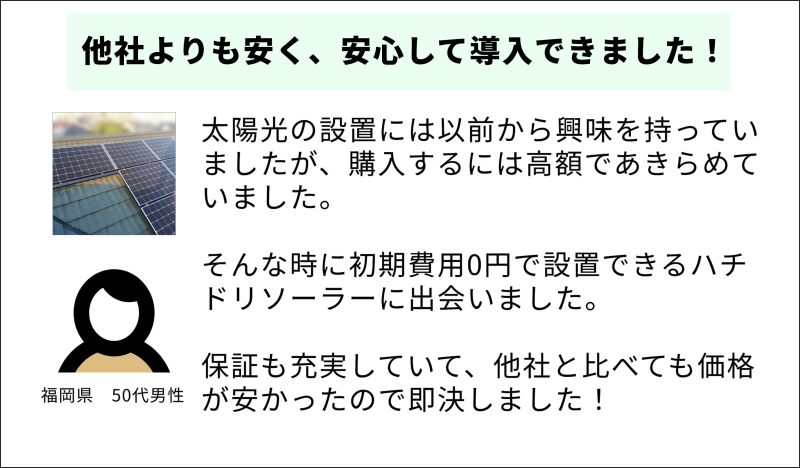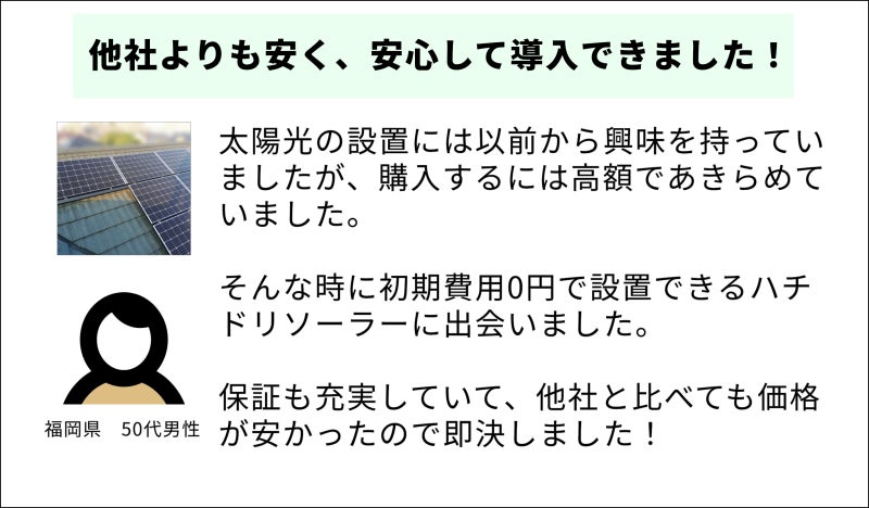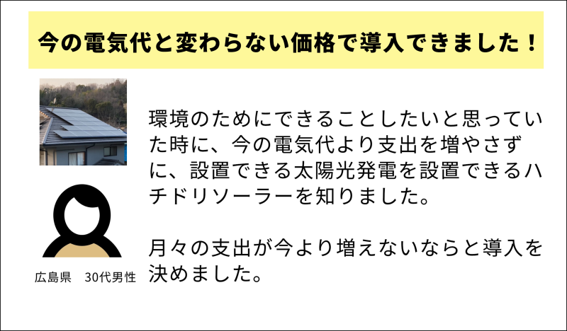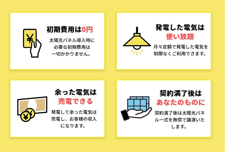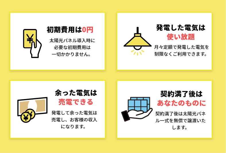 太陽光パネル導入時に必要な初期費用は一切かかりません。 導入時の工事費用や太陽光パネル等の機器も費用負担0で導入いただけます。
