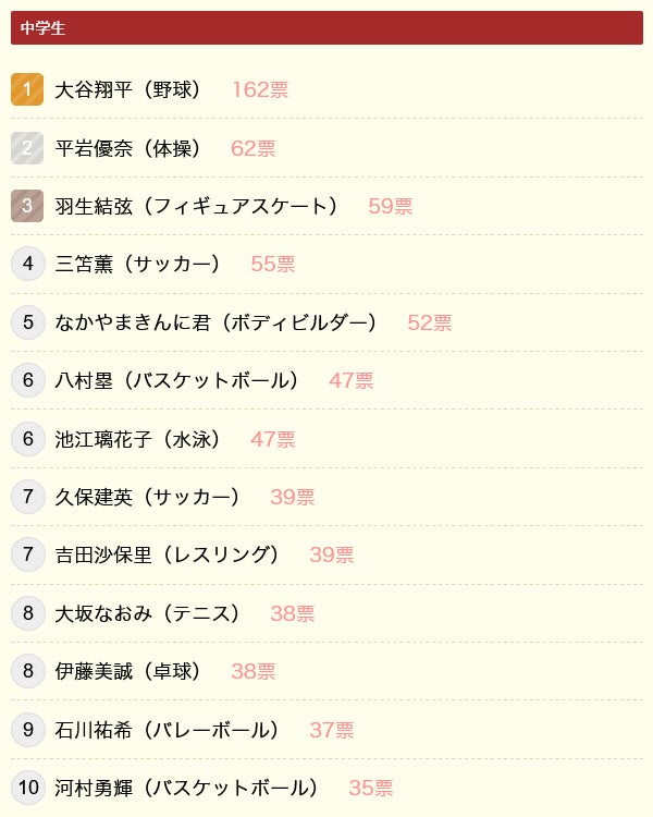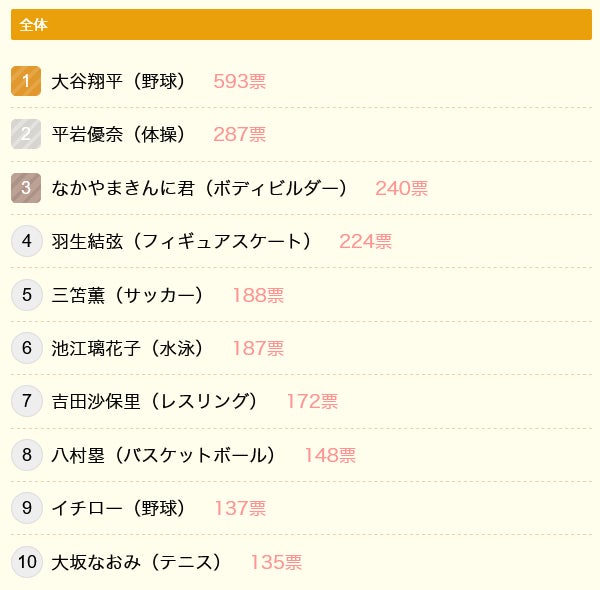どの年代でも圧倒的に支持されているのが、野球の大谷翔平選手です。2位の体操・平岩優奈選手と大きく差をつけて1位に輝きました。
