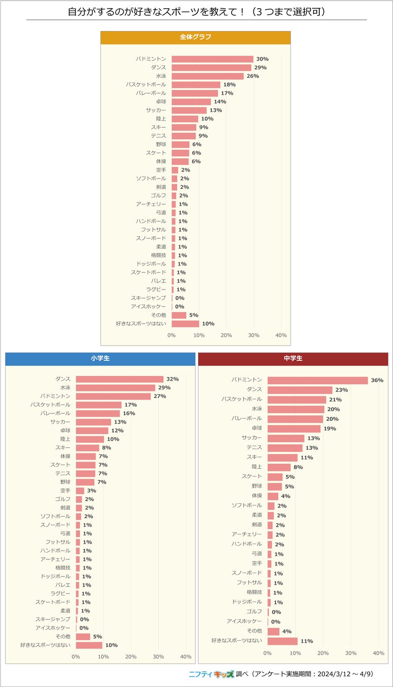 一方で、体育の授業については44%が「好き」、29%が「嫌い」と回答しました。体育の中での苦手な種目は小学生では「水泳」、中学生では「長距離走」が1位でした。