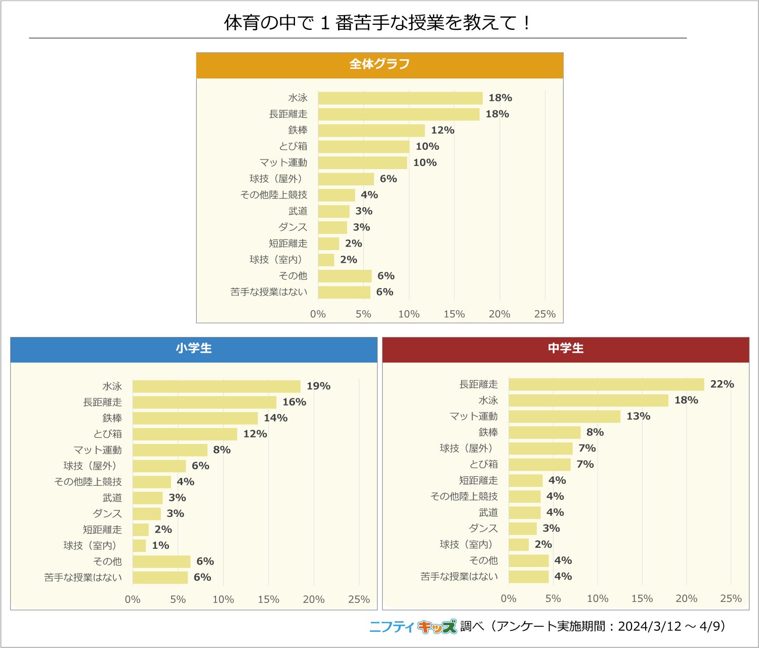 【調査結果】苦手な体育の種目1位、小学生「水泳」、中学生「長距離走」