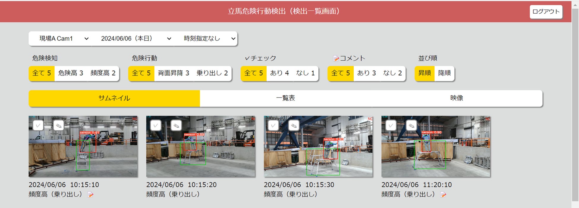 実証方法は、モニターとなる当該建設現場の職長や作業員が、当日の作業終了時もしくは翌日の作業開始時に、本システムを使用して危険行動の検出情報(映像データ、発生時間、危険行動の種類)を閲覧し、自己の危険行動について振り返りを行い、自身で是正することを基本行動として実施します。