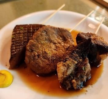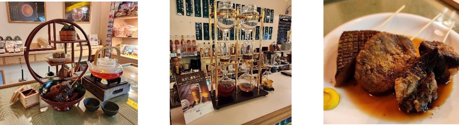 醤油をきかせたおでん汁に、黒はんぺん、牛すじ、大根、こんにゃく、卵などを染みこませた静岡名物の黒おでんを提供します。凛茶をブレンドしたオリジナルだし粉をかけて味わってください。