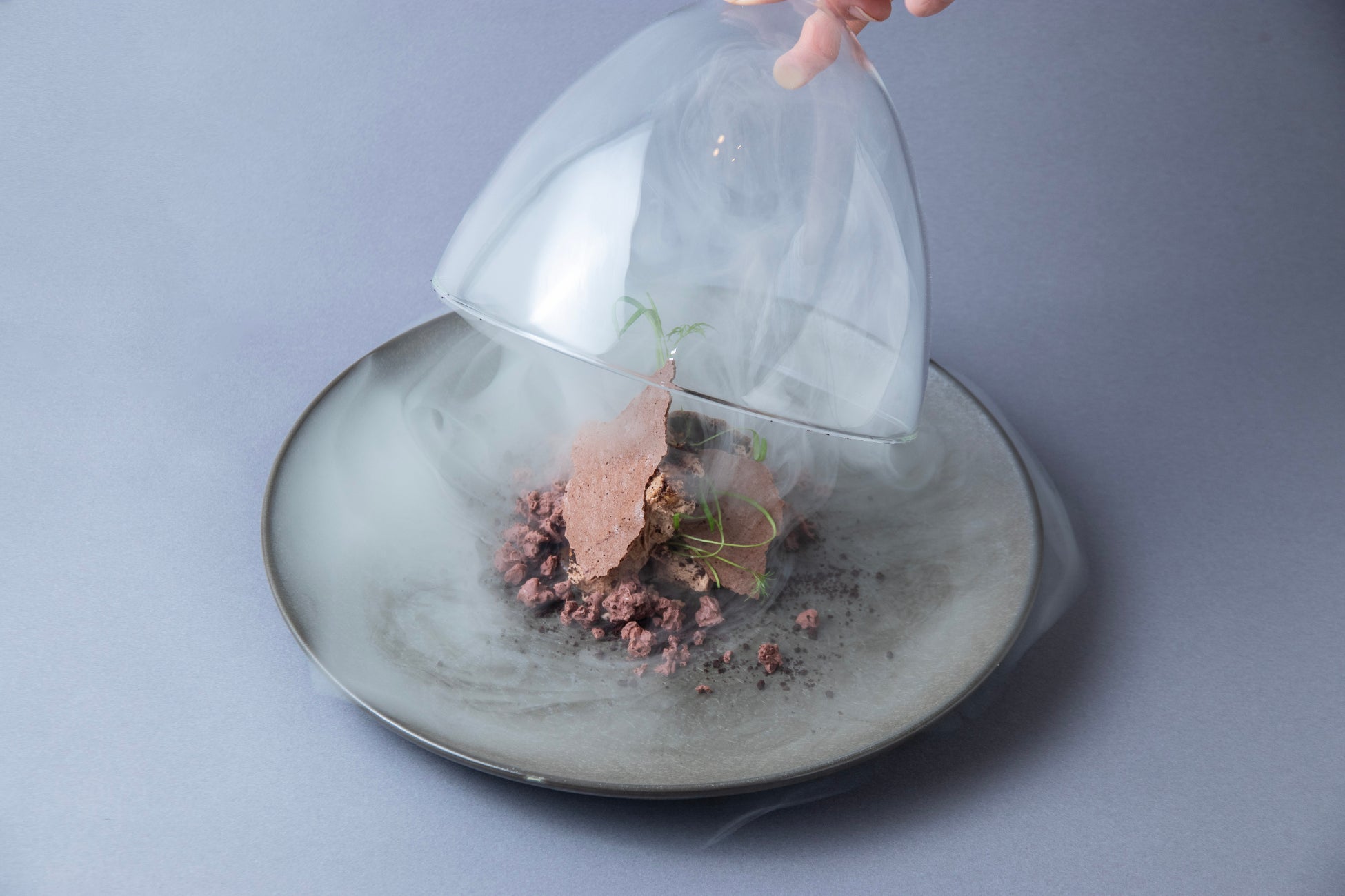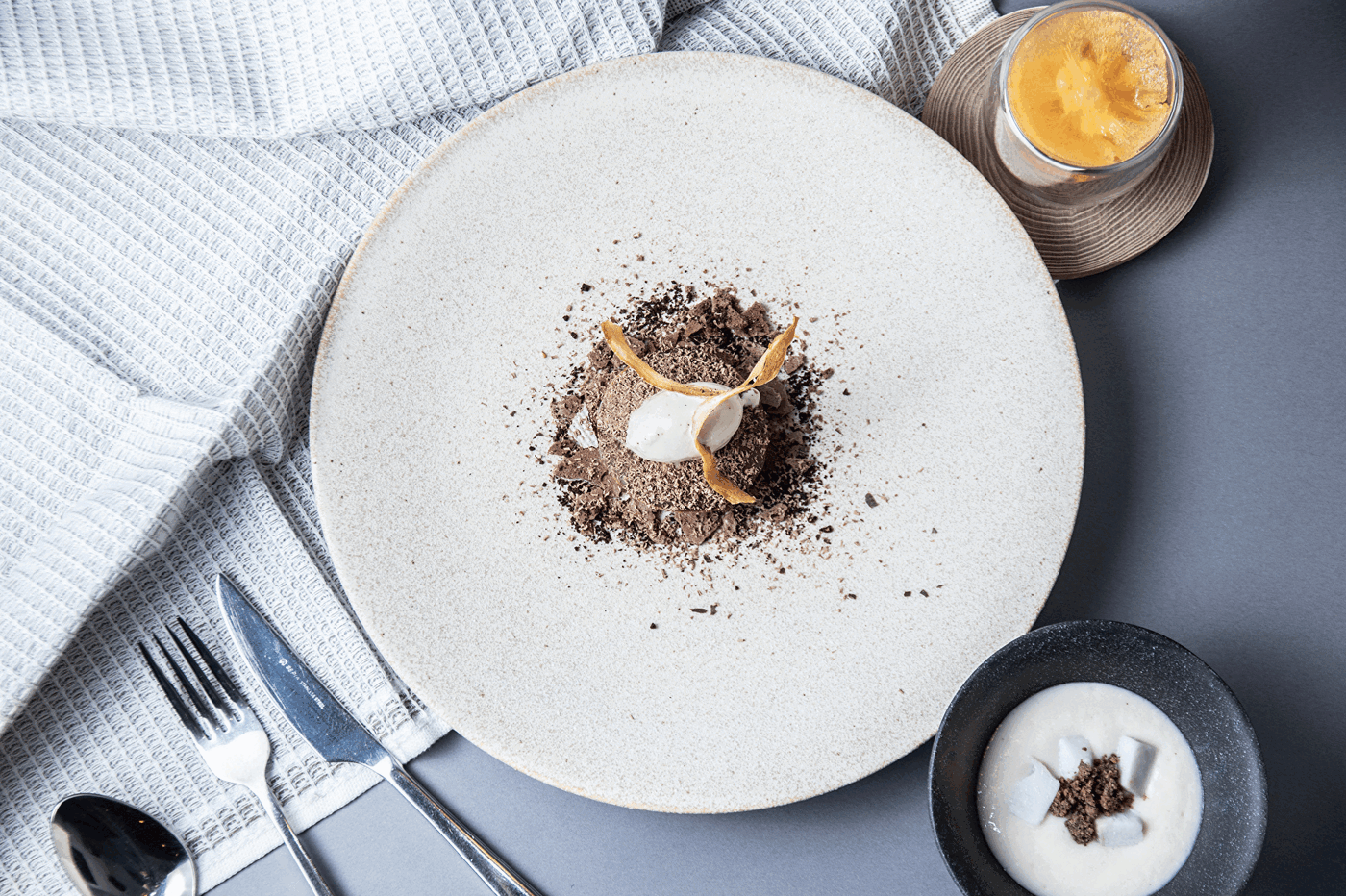 タルト生地にはミルクチョコレートとパッションフルーツのガナッシュを、ごぼうのカスタードクリームとダークチョコレートのクリームをのせ、仕上げにごぼうのアイスとチップスを添えました。山椒の香りがアクセントです。