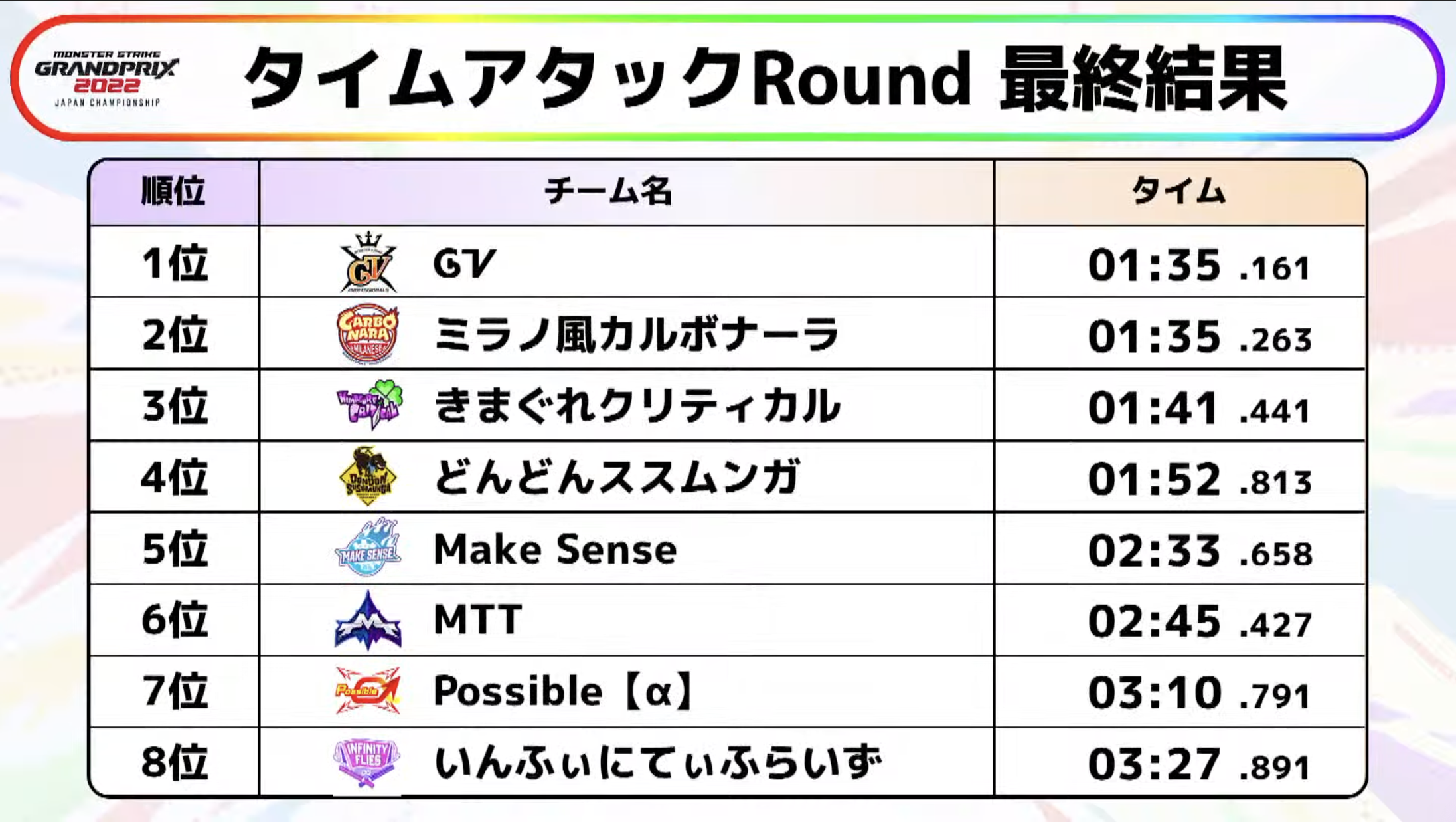 本日実施したタイムアタックRoundでは、「輝問の聖獣少女(光)」のクリアタイムを競い合い、決勝トーナメントの組み合わせが決定しました。見事1位のタイムをたたき出したのは、優勝チーム予想ミッションでも1位を獲得した「GV」。続く2位は、優勝チーム予想ミッション2位の「ミラノ風カルボナーラ」で、前回大会「モンストグランプリ2021 ジャパンチャンピオンシップ」優勝・準優勝チームがそれぞれ1位、2位を獲得するという結果となりました。1位と2位の差はわずか0.1秒で、タイムアタックRoundから手に汗握る激戦が繰り広げられました。
