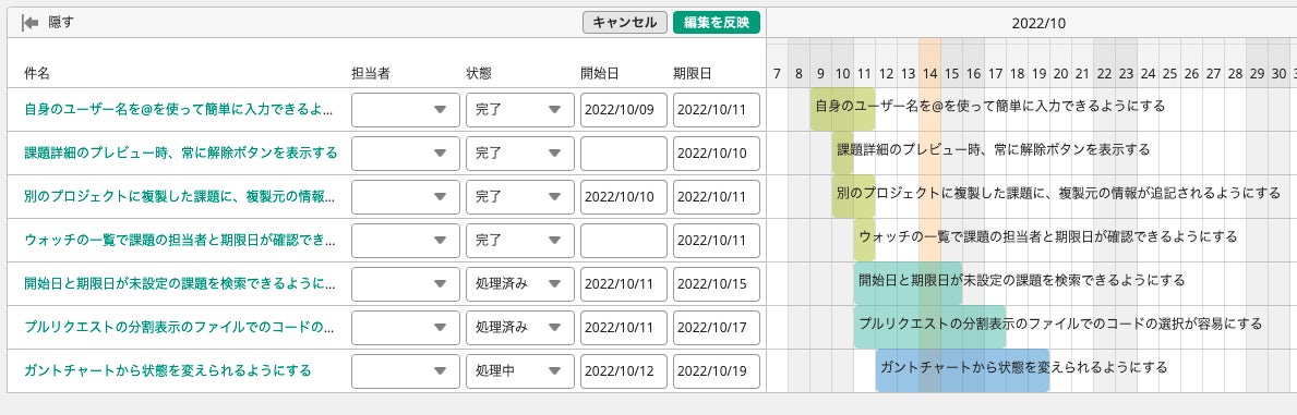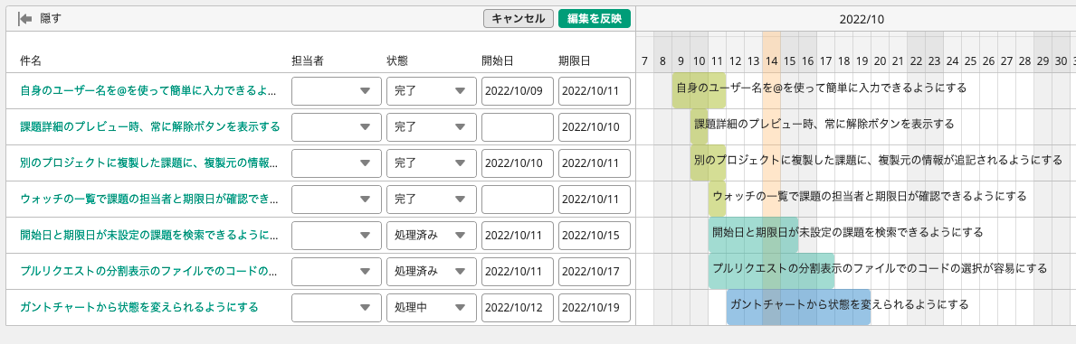 従来のガントチャートを表示する画面では、「担当者」「開始日」「期限日」のみが変更できました。今回ここに「状態」を追加したことで、ガントチャートの画面から、タスクのステータスを「処理中」「処理済」「完了」などに変更することができるようになりました。