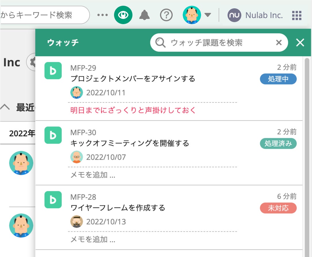 従来のウォッチ機能では参照できる情報はごくわずかでしたが、今回のアップデートにより、ウォッチの一覧に表示される課題上に担当者と期限日を追加しました。タスクの内容確認のために、逐一クリックし中身を確認する必要がなくなったことで、スムーズな確認作業ができるようになります。