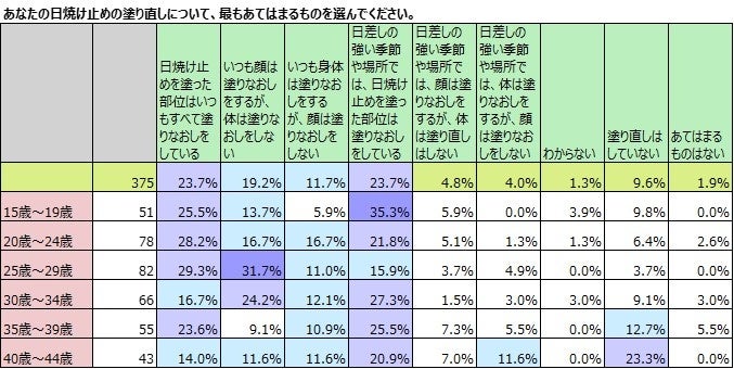 年齢別に見てみると15歳~29歳までの若年層の方が「いつもすべて塗りなおしている」と答えている割合が高く3割近くに上ります。日焼け止めの塗りなおしをしていないのは35歳~39歳で12.7%と1割を超え、40歳~44歳で23.3%と2割を超えていることからも、日焼け止めは塗りなおさなければならないものであるという情報は若年層への方が届いているのかもしれません。