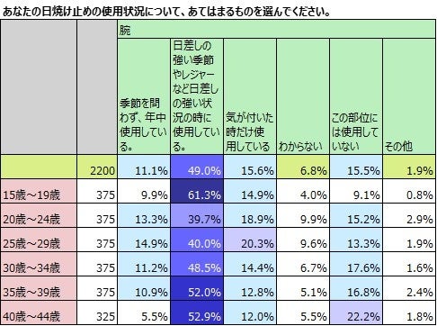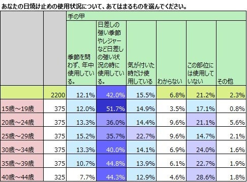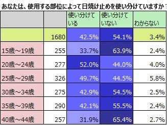 「部位によって日焼け止めを使い分けているのは4割超。20代では約5割。