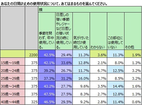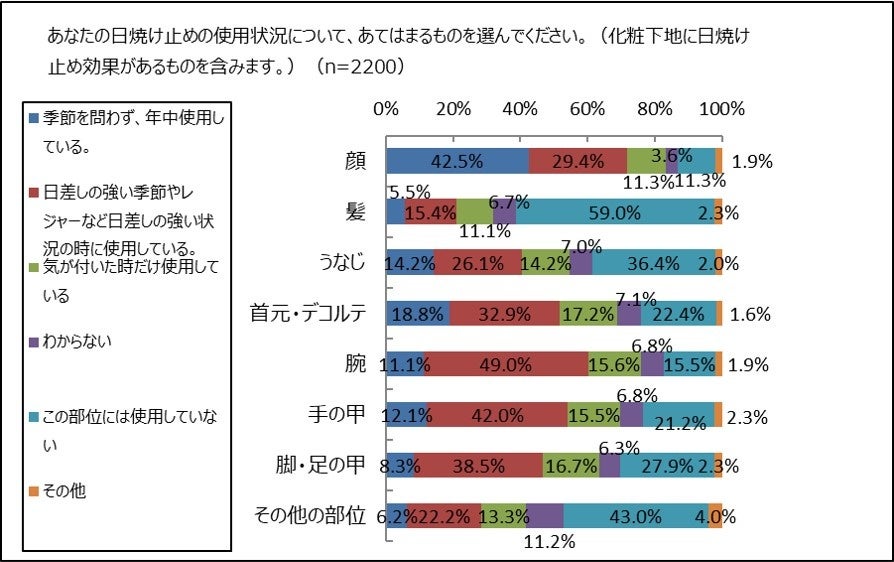 15歳から44歳の2,200名の女性に、日焼け止めの使用状況について部位別に聞きました。最も多く使用している部位は「顔」で83.2%。(「季節を問わず、年中使用している」・「日差しの強い季節やレジャーなど日差しの強い時に使用している」・「気が付いた時に使用している」の合計)。「顔」に続いて「腕」が75.7%で2位。3位は「手の甲」で69.6%でした。顔に日焼け止めを使用していると答えた人のうち半数を超える42.5%が、「季節を問わず、年中使用している」と答えています。