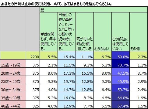 使用部位として最も多い「顔」について年齢別に見てみると、「季節を問わず、年中使用している」のが最も多いのは35歳~39歳で47.5%。40歳~44歳でも46.5%と半数に迫ることがわかりました。「顔」に続いて次に多かった「腕」について見てみると、「季節を問わず、年中使用している」のが多いのは20代で、20歳~24歳で13.3%、25歳~29歳で14.9%でした。「日差しの強い季節やレジャーなど日差しの強い時に使用している」のは、15歳~19歳が最も多く61.3%と6割を超えました。3位の「手の甲」については、「季節を問わず、年中使用している」のは、25歳~29歳が多く、「日差しの強い時に使用している」のは15歳~19歳が多いですが、「年中使用している」と「日差しが強い時に使用している」「気が付いた時に使用している」を合わせると69.6%と約7割に上り、手の日焼け対策も一般化していると考えられます。「髪」への使用は全体では32%で、年齢別に見て多いのは20代。20歳~24歳で40.8%、25歳~29歳で41.8%と4割以上に上ります。