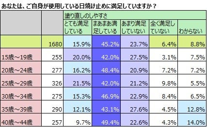 日焼け止めを使用している1,680名の女性に、現在使用している日焼け止めへの不満について聞きました。最も不満と答えた割合が多いのは「塗り直しのしやすさ」で、「あまり満足してない」23.7%と「全く満足していない」6.4%を合わせて30.1%と3割を超える人が不満と答えました。「塗った際の心地よさ」では24.3%が不満だと答えています。これを年齢別に見てみると、いずれも若年層の方が使用している日焼け止めへの満足度が高く、高齢層の方が満足度が低いことがわかりました。