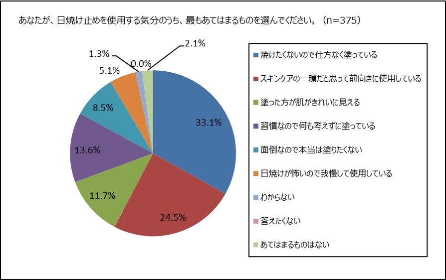 日焼け止めを使用している375名の女性に、日焼け止めを使用する時の気分について聞きました。全体では、「焼けたくないので仕方なく塗っている」のが、33.1%で1位ですが、2位には「スキンケアの一環だと思って前向きに使用している」24.5%、「塗った方が肌がきれいに見える」11.7%と、使用に前向きな気分も見受けられます。