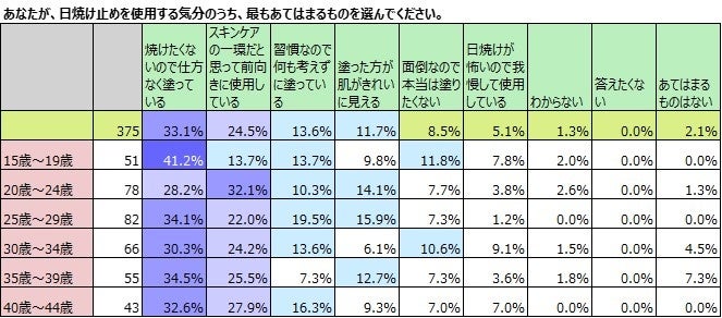 年齢別で見てみると、15歳~19歳の若年層では「焼けたくないので仕方なく塗っている」が41.2%とすべての世代で最も多い割合ですが、20歳~24歳では「スキンケアの一環だと思って前向きに使用している」が、32.1%で「焼けたくないので仕方なく塗っている」の28.2%よりも多い結果となりました。「スキンケアの一環だ」と答えているのは、20歳~24歳が最も高い割合で25歳~29歳になると減りますが、それ以降は歳を重ねるにつれ徐々に増えていく傾向が見られました。