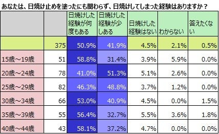 「日焼け止めを使用して日焼けした経験はない」は4.5%のみ。年齢による差はない。